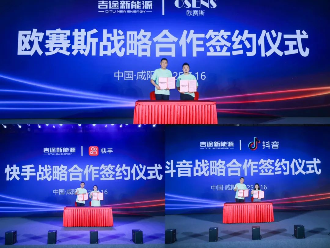 2025年吉途新能源发展元年,携手抖音平台、快手平台以及欧赛斯公司达成战略合作。四方聚焦品牌战略规划与线上流量拓展,整合资源构建线上线下融合生态,以数据驱动、模式创新打造品牌增长新引擎。会上,“吉商工程”重磅启动。吉途新能源将深度融合线上平台流量优势与线下渠道资源,打通消费场景闭环,通过数字化营销与经销商赋能,激活终端市场,在激烈的新能源赛道中突围,全力迈向行业前列。