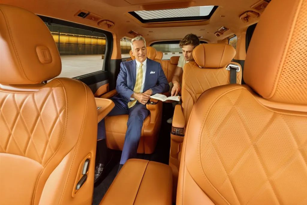 内饰方面,新车采用大尺寸的贯穿屏,中控屏与副驾屏贯穿相连。新车将提供4座版、6座版和7座版车型,6座版车型采用2+2+2的三排座椅布局,第二排和第三排采用豪华的座椅,每排座椅都有独立扶手,宽大舒适。4座版车型则前后通过电视幕墙隔离开,将会配备更加豪华的后排座椅。