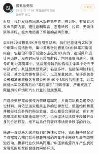 9月12日,极氪法务部也发布声明,自极氪9X开启预售以来,已经监测和查证到46个MCN机构旗下的超过230个账号集中发布针对极氪9X的抹黑攻击和造谣内容,已经固定证据,并向司法机关递交诉讼材料,将依法追究相关主体的法律责任。